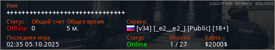 Играет на Counter Strike Source сервере. Страна: РоссияПервый раз замечен 02:22 05.10.2025