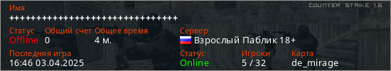 Играет на Counter Strike 1.6 сервере. Страна: РоссияПервый раз замечен 16:42 03.04.2025