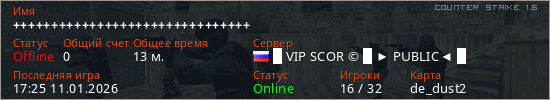 Играет на Counter Strike 1.6 сервере. Страна: РоссияПервый раз замечен 23:00 10.01.2026