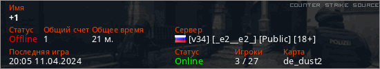 Играет на Counter Strike Source сервере. Страна: РоссияПервый раз замечен 15:12 31.03.2024