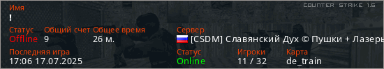 Играет на Counter Strike 1.6 сервере. Страна: РоссияПервый раз замечен 00:03 28.10.2024
