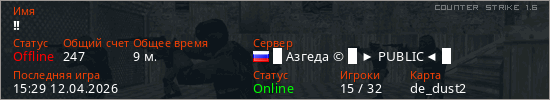 Играет на Counter Strike 1.6 сервере. Страна: РоссияПервый раз замечен 19:56 04.04.2026