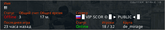 Играет на Counter Strike 1.6 сервере. Страна: РоссияПервый раз замечен 15:08 23.08.2025