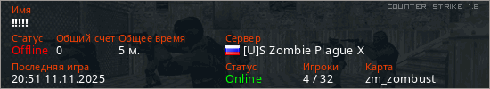Играет на Counter Strike 1.6 сервере. Страна: РоссияПервый раз замечен 20:47 11.11.2025