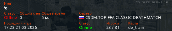Играет на Counter Strike 1.6 сервере. Страна: РоссияПервый раз замечен 17:21 21.03.2026