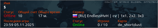 Играет на Counter Strike Global Offensive сервере. Страна: РоссияПервый раз замечен 19:20 05.11.2025