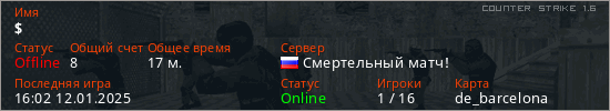 Играет на Counter Strike 1.6 сервере. Страна: РоссияПервый раз замечен 15:55 11.07.2023