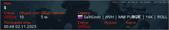 Играет на Counter Strike Global Offensive сервере. Страна: РоссияПервый раз замечен 00:04 02.11.2025