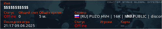 Играет на Counter Strike Global Offensive сервере. Страна: РоссияПервый раз замечен 21:01 09.06.2025
