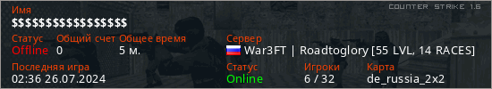Играет на Counter Strike 1.6 сервере. Страна: РоссияПервый раз замечен 02:03 26.07.2024