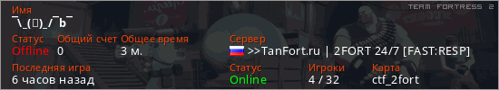 Играет на Team Fortress 2 сервере. Страна: РоссияПервый раз замечен 21:55 20.01.2026