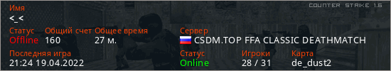 Играет на Counter Strike 1.6 сервере. Страна: РоссияПервый раз замечен 18:57 15.04.2022