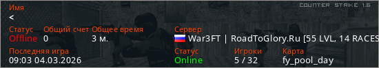 Играет на Counter Strike 1.6 сервере. Страна: РоссияПервый раз замечен 09:03 04.03.2026