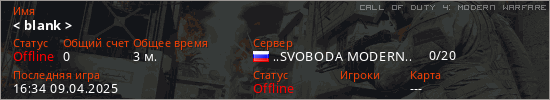 Играет на Call of Duty 4: Modern Warfare сервере. Страна: РоссияПервый раз замечен 16:34 09.04.2025