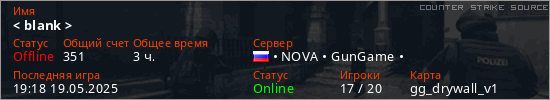 Играет на Counter Strike Source сервере. Страна: РоссияПервый раз замечен 12:16 17.08.2022