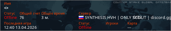 Играет на Counter Strike Global Offensive сервере. Страна: РоссияПервый раз замечен 12:20 13.04.2026