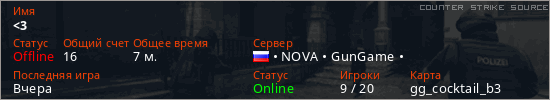 Играет на Counter Strike Source сервере. Страна: РоссияПервый раз замечен 12:50 03.05.2023