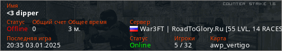 Играет на Counter Strike 1.6 сервере. Страна: РоссияПервый раз замечен 20:35 03.01.2025