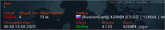 Играет на Counter Strike Global Offensive сервере. Страна: РоссияПервый раз замечен 17:14 12.08.2025