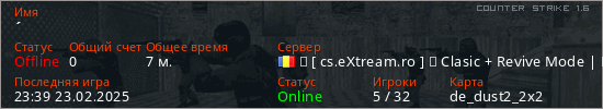 Играет на Counter Strike 1.6 сервере. Страна: РумынияПервый раз замечен 23:08 28.12.2024
