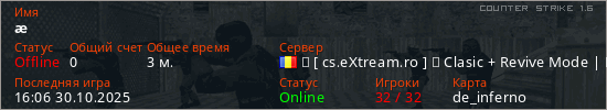 Играет на Counter Strike 1.6 сервере. Страна: РумынияПервый раз замечен 16:06 30.10.2025