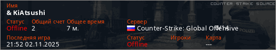 Играет на Counter Strike Source сервере. Страна: РоссияПервый раз замечен 22:55 27.10.2025