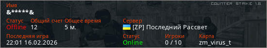 Играет на Counter Strike 1.6 сервере. Страна: УкраинаПервый раз замечен 01:39 16.02.2026