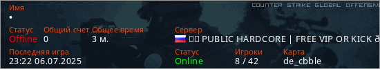 Играет на Counter Strike Global Offensive сервере. Страна: РоссияПервый раз замечен 23:22 06.07.2025