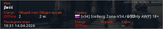 Играет на Counter Strike Source сервере. Страна: РоссияПервый раз замечен 19:31 14.04.2026