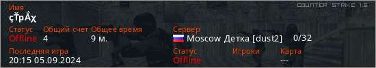 Играет на Counter Strike 1.6 сервере. Страна: РоссияПервый раз замечен 21:34 02.09.2024