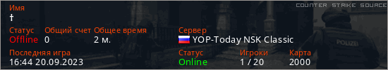 Играет на Counter Strike Source сервере. Страна: РоссияПервый раз замечен 16:44 20.09.2023