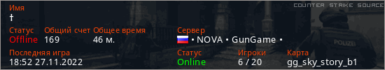 Играет на Counter Strike Source сервере. Страна: РоссияПервый раз замечен 18:08 27.11.2022