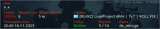 Играет на Counter Strike Global Offensive сервере. Страна: КазахстанПервый раз замечен 17:32 23.08.2025