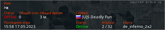 Играет на Counter Strike 1.6 сервере. Страна: РоссияПервый раз замечен 15:58 17.05.2023