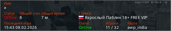 Играет на Counter Strike 1.6 сервере. Страна: РоссияПервый раз замечен 13:52 08.02.2026