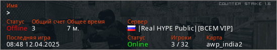 Последний раз был в сети 08:48 12.04.2025 Игрок с таким ником замечен на 32 серверах