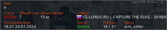 Последний раз был в сети 18:21 24.01.2024 Игрок с таким ником замечен на 32 серверах