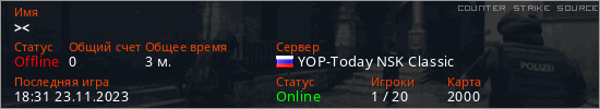 Играет на Counter Strike Source сервере. Страна: РоссияПервый раз замечен 18:31 23.11.2023