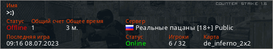 Играет на Counter Strike 1.6 сервере. Страна: РоссияПервый раз замечен 09:16 08.07.2023