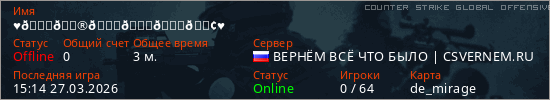 Играет на Counter Strike Global Offensive сервере. Страна: РоссияПервый раз замечен 15:14 27.03.2026