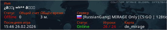 Играет на Counter Strike Global Offensive сервере. Страна: РоссияПервый раз замечен 15:46 26.02.2026