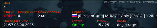 Играет на Counter Strike Global Offensive сервере. Страна: РоссияПервый раз замечен 21:57 08.08.2025