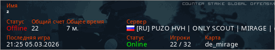 Играет на Counter Strike Global Offensive сервере. Страна: РоссияПервый раз замечен 21:17 05.03.2026
