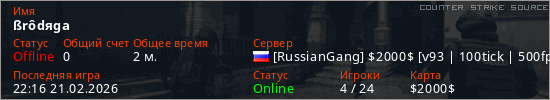Играет на Counter Strike Source сервере. Страна: РоссияПервый раз замечен 22:16 21.02.2026