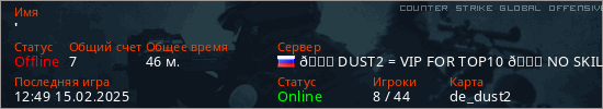 Играет на Counter Strike Global Offensive сервере. Страна: РоссияПервый раз замечен 21:21 20.01.2025