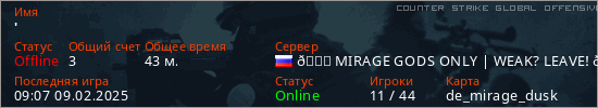 Играет на Counter Strike Global Offensive сервере. Страна: РоссияПервый раз замечен 21:31 21.02.2024