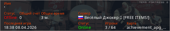 Играет на Team Fortress 2 сервере. Страна: РоссияПервый раз замечен 18:38 08.04.2026