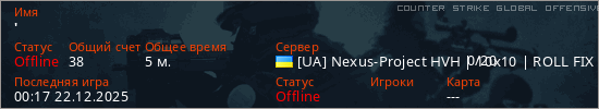 Играет на Counter Strike Global Offensive сервере. Страна: УкраинаПервый раз замечен 00:01 22.12.2025