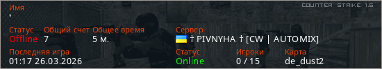 Играет на Counter Strike 1.6 сервере. Страна: УкраинаПервый раз замечен 00:56 26.03.2026