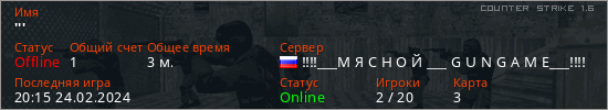 Играет на Counter Strike 1.6 сервере. Страна: РоссияПервый раз замечен 20:15 24.02.2024